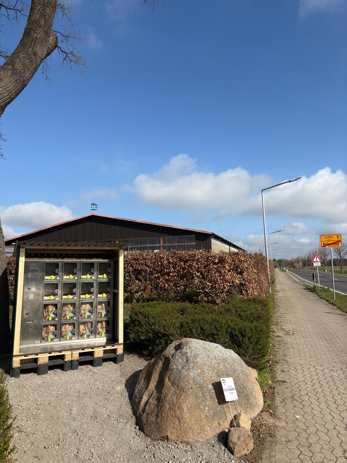 Hof ein Verkaufsautomat. Hier können Interessierte Eier aus Freilandhaltung und geschmackvolle Kartoffeln erwerben. Die Ware wird von einem darauf spezialisierten Betrieb aus Harenberg geliefert.